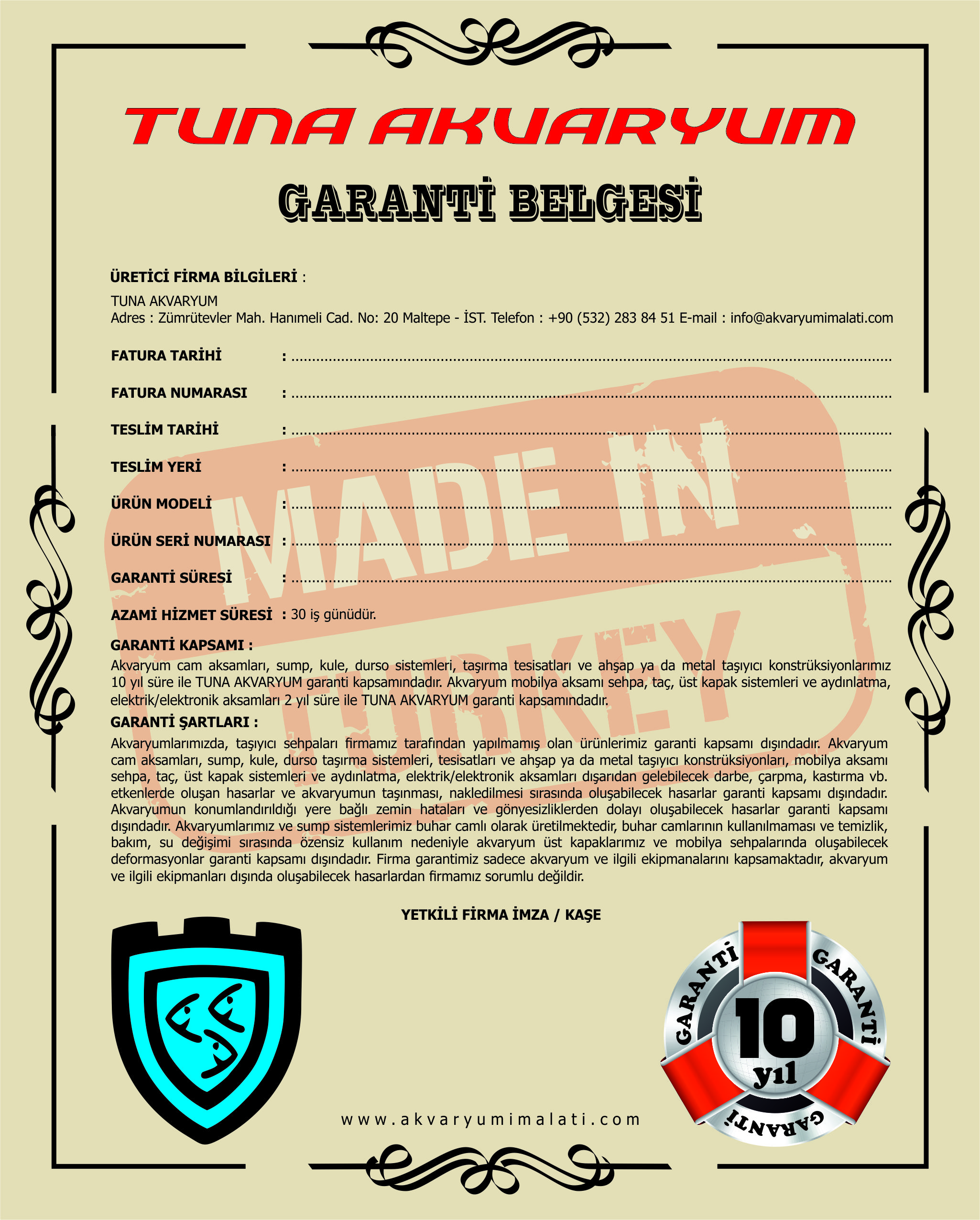 Akvaryum cam aksamları, sump, kule, durso sistemleri, taşırma tesisatları ve ahşap ya da metal taşıyıcı konstrüksiyonlarımız 10 yıl süre ile TUNA AKVARYUM garanti kapsamındadır. Akvaryum mobilya aksamı sehpa, taç, üst kapak sistemleri ve aydınlatma, elektrik/elektronik aksamları 2 yıl süre ile TUNA AKVARYUM garanti kapsamındadır.